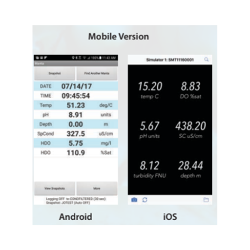 El software Manta presenta menús intuitivos y fáciles de usar. Las instrucciones guían al usuario a través de la calibración de cada sensor. Fácil configuración para archivos de “instantáneas” de muestreo discreto o archivos de registro para registros internos, utilizando la arquitectura de Windows. Todas las moscas están en formato .csv. El software MantaLink está disponible para Android e iOS con funciones de pantalla pequeña, como páginas que se pueden deslizar y números grandes y de alto contraste para facilitar la visibilidad a la luz del sol.